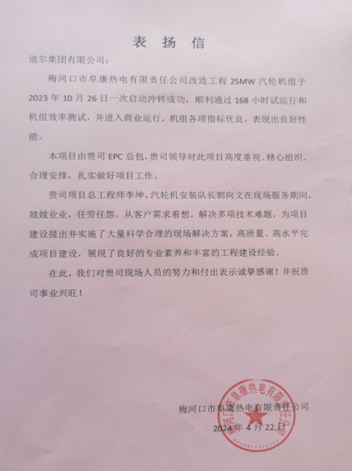 山東工程設(shè)計(jì)院梅河口市阜康熱電4號汽輪機(jī)低碳節(jié)能技改EPC總承包項(xiàng)目喜獲業(yè)主表揚(yáng)信